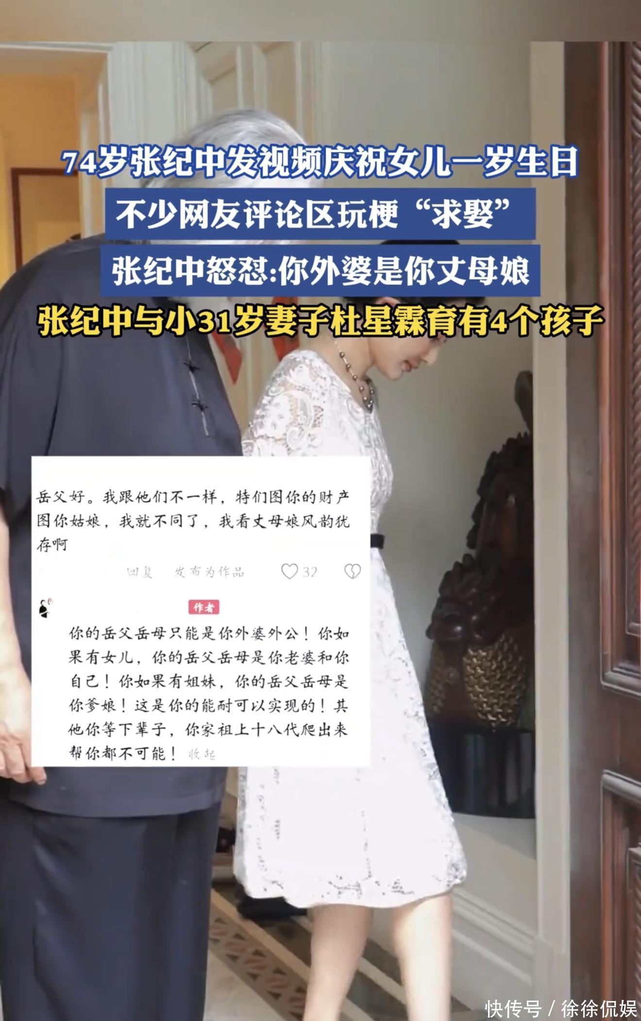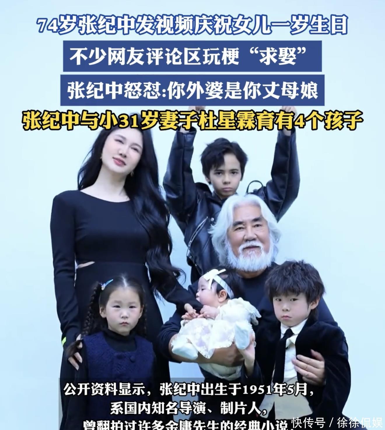 前言:一场本该温馨的生日宴,愣是把微博、抖音搅得天翻地覆画面中,74岁的张纪中白发苍苍,怀里搂着穿粉色公主裙岁小闺女。边上站着小岁的媳妇杜星霖,一家三口围着插着"1"字蜡烛的蛋糕,笑得那叫一个灿烂。谁承想,就这么个日常晒娃视频,直接让评论区秒变"大型翻车现场"。"这难道真不是爷爷带着孙女吗?""老爷子这岁数还能带得动娃吗?""等闺女念大学,老爹都九十多了吧..."好家伙,这波吐槽来得又猛又急。更绝的是杜星霖的硬核回怼:"键盘侠们尽管放马过来,来一个我怼一个!"这场生日宴引发的吃瓜大战,愣是演变成了当代婚恋观的大型辩论现场。【一个视频,两种解读】仔细品品张纪中发的这个庆生视频,其实藏着不少暖心细节。老爷子小心翼翼地扶着闺女肉嘟嘟的小手切蛋糕,眼神里的温柔都快溢出屏幕了。小丫头咿咿呀呀地喊着"爸爸",小手还不安分地揪着老爹的白胡子。杜星霖在旁边举着手机记录,笑得见牙不见眼。可就是这么有爱的画面,愣是被网友们解读出了两个极端:一波人直呼"好甜":"老爷子晚年得女,简直人生赢家";另一波人却疯狂吐槽:"这孩子以后在学校得承受多大压力"。这场争论早就超出了家长里短的范畴,直接升级成了关于婚恋观、代际差异的社会话题。